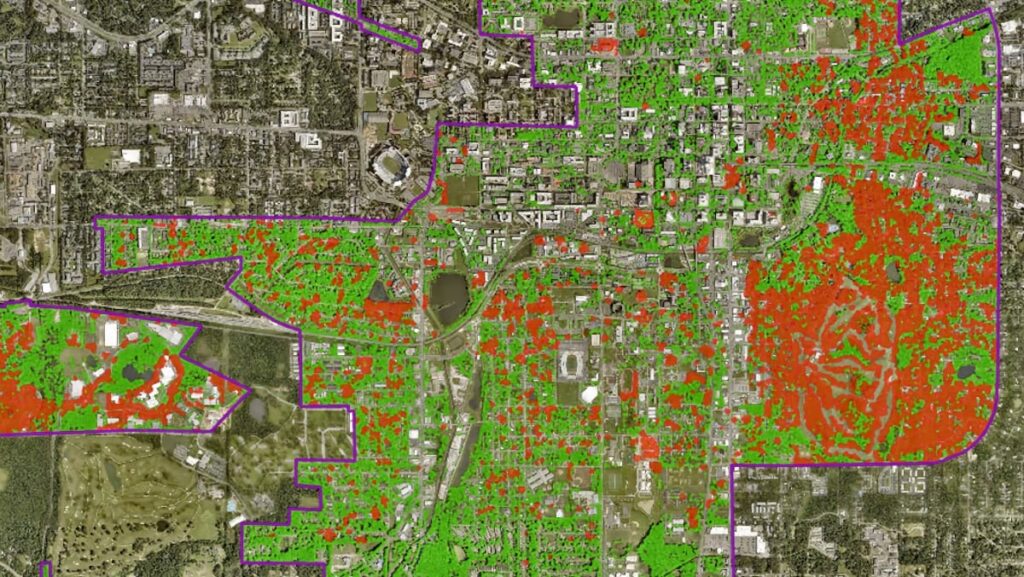 แผนที่ประเมินความเสียหายของต้นไม้โดย AI แสดงรูปแบบผลกระทบจากพายุทั่วเมืองแทลลาแฮสซี พื้นที่สีเขียวแสดงถึงความสมบูรณ์ของต้นไม้ ส่วนพื้นที่สีแดงระบุความเสียหายที่ต้องได้รับการดูแล การวิเคราะห์อัตโนมัตินี้ช่วยย่นระยะเวลาจากการสำรวจภาคสนามด้วยมือเป็นหลายเดือน ให้เหลือเพียงไม่กี่วันด้วยการประมวลผลของคอมพิวเตอร์