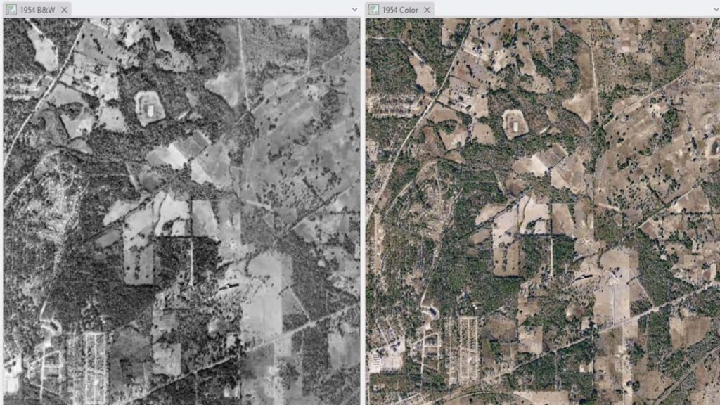 TLCGIS ใช้ AI ในการเติมสีให้กับภาพถ่ายทางอากาศเก่า เช่นภาพขาวดำจากปี 1954 (ซ้าย) ที่ถูกเปลี่ยนให้กลายเป็นภาพสีสมบูรณ์ (ขวา) เทคโนโลยี GeoAI นี้ช่วยให้นักประวัติศาสตร์และนักวางผังเมืองมองเห็นพัฒนาการและการเปลี่ยนแปลงของภูมิทัศน์เมืองแทลลาแฮสซีได้อย่างชัดเจนตลอดหลายทศวรรษที่ผ่านมา