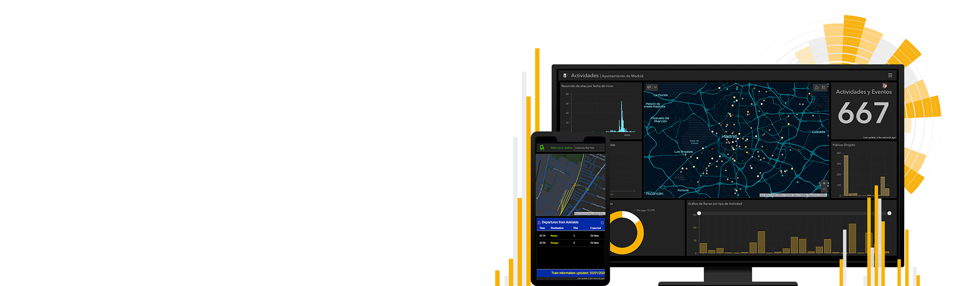 ArcGIS Dashboards ລວມຂໍ້ມູນຕ່າງໆທີ່ໄດ້ຮັບຈາກການວິເຄາະທາງກວ້າງຂອງພື້ນ. (Location-based analytics) ແລະສະແດງໃນຮູບແບບຂອງຂໍ້ມູນແບບ Intuitive ແລະຂໍ້ມູນແບບໂຕ້ຕອບພາຍໃນ ໜ້າ ດຽວ ບັນດາອົງກອນທີ່ ນຳ ໃຊ້ ArcGIS platform ສາມາດໄດ້ຮັບຜົນປະໂຫຍດຈາກການ ນຳ ໃຊ້ ArcGIS Dashboards ເພື່ອຕັດສິນໃຈ. ຊອກຫາຢູ່ໃນທ່າອ່ຽງໃນອະນາຄົດ ການຕິດຕາມສະຖານະພາບ Real-time ແລະການແຈ້ງເຕືອນພາຍໃນກຸ່ມ. Dashboards ຍັງສາມາດປັບປ່ຽນໄດ້. ເພື່ອໃຫ້ຜູ້ໃຊ້ສາມາດຊອກຫາ ຄຳ ຕອບທີ່ພວກເຂົາ ກຳ ລັງຊອກຫາໄດ້ງ່າຍ, ພຽງແຕ່ເລື່ອນຂໍ້ມູນ ຂໍ້ມູນກ່ຽວກັບຜະລິດຕະພັນ, ເຊັ່ນ: ແຜນທີ່ແລະການ ນຳ ໃຊ້ພາຍໃນ Dashboards ຈຳ ເປັນຕໍ່ Geospatial Infrastructure
